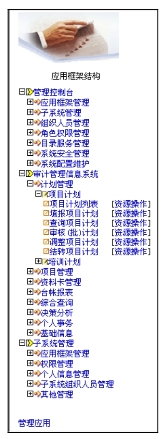 各个应用的功能入口按照其级别在树上分层显示。树结构的第一层显示应用名称,点击应用名称链接显示该应用的模块组列表。树结构的第二层显示模块组拥有的模块(即模块分配),点击模块组名称链接显示模块列表。树结构的第三层显示模块名称,点击模块名称链接显示模块资源信息。