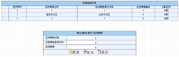 应用频道是将相关的应用集合在一起划分的管理级别,用以实现对相关功能进行级别上的管理。应用频道管理用来实现对应用频道的添加、删除以及详细信息修改等功能,同时也对应用频道的应用进行相应设置。
