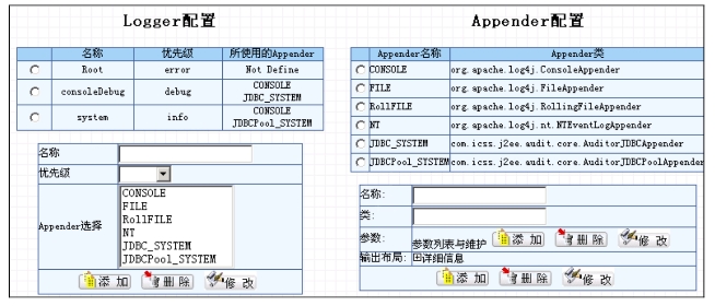 右侧的Appender配置包括对系统使用的Appender进行增加、修改、删除。具体信息有名称(Appender的名称)、类(此Appender对应于Log4J和JDK1.4日志系统中的哪个类)、参数(对日志输出文件的设定以及对数据库中日志表信息的维护等各种相关信息设定,系统提供了对参数的增加、删除、修改,属性为名称—参数名称,值—名称对应的值)、输出布局(对输出的日志信息的格式设定,点击“详细信息”,将显示对输出布局的增加、删除、修改的维护界面,具体信息有:类—日志输出布局触发类,参数名称—输出日志信息中包含的参数,参数值—参数的值信息),系统根据Logger查找到相应的Appender后,会根据Appender的详细信息,输出日志或存储日志信息。