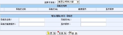首先选择子系统,如图10.7-1中选择了“集团公司审计部”,上方列出了该子系统的导航栏中的条目。列表下方是增删改区域,可以对导航栏中的条目进行增、删、改操作,不再多述。如果集团公司审计部的人员登录平台,其系统导航栏中将显示这两个条目。