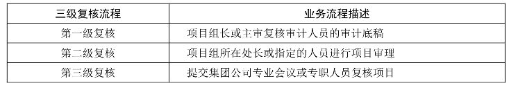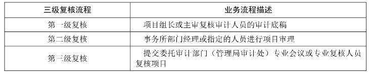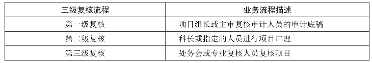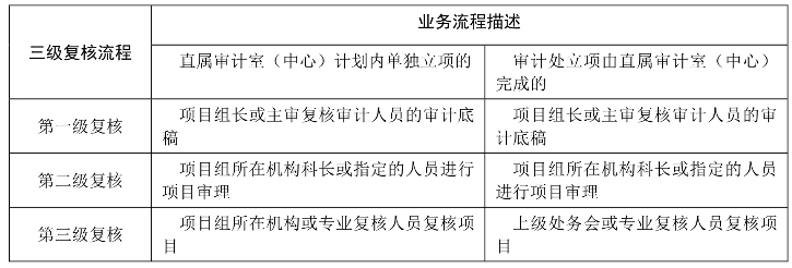(1)三级复核:实行审计组长(主审)、科室负责人、专职复核人员(专职业务会议)三级复核制度。审计组组长对组员的《审计日记》、《审计工作底稿》等进行复核;审计业务科室负责人对《审计报告》、代拟的《审计意见书》、《审计处理处罚决定书》等及所附材料进行复核;专职复核人员或专职业务会议在审计业务科复核的基础上对上述材料进行复核,出具审计复核意见书。