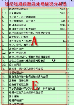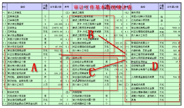 如附图1所示,审计工作基本情况统计表的经济成果金额D部分是由A、B、C三部分问题经整改后形成的经济成果组成。而附图1的A部分数据来源于违纪违规问题及处理情况分类表(附图2)的A(违纪违规问题)部分,不包括E部分的问题金额。因此,附图1的经济成果数据来源是由附图2的第1~14项问题整改形成,即在操作中,如果第15~22项的某一项问题形成了经济成果,也不反映在附图1的成果部分当中。