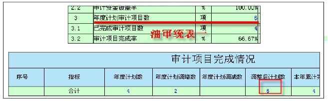 审计工作基本情况统计表(油审统表一)中的“年度计划审计项目数”指的是本年内要审计的项目数,该项目数随着项目的调整而增加或减少。即年度计划审计项目数=年初计划数+年度计划调增数(计划外项目)-年度计划调减数,它和审计项目完成情况表(油审统表三)中调整后的计划数一致,如附图4所示。