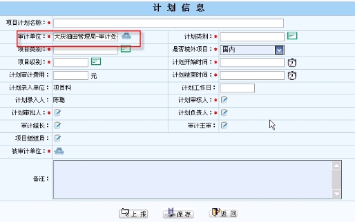 如附图3所示,在填报审计项目计划时,审计单位选择了哪一级的审计机构,该项目就汇总到哪一级的审计台账和报表中。对于立项单位和执行单位不是同一级的审计机构,比如某管理局有审计处和直属审计室(中心)两个审计机构,审计处主要负责审计管理职能,审计中心负责具体审计业务,这时,如果是管理局的审计项目立项在审计处,由审计中心执行,则审计报表的数据就在审计处,而审计中心由于没有立项,则审计报表没有数据。有时为了考核业务单位工作业绩的需要,在管理信息系统中可以这样处理: