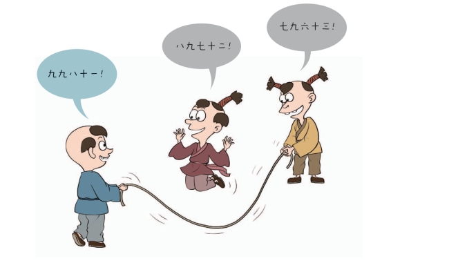 古人还发明了九九乘法口诀,又叫小九九,排列顺序和你现在看到的正好相反。你可以脑补一下战国的小朋友们一边跳绳一边背诵口诀的样子哦,像不像背乘法口诀表的你……
