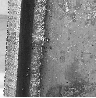 从工件下端定位焊缝处引弧,引燃电弧后拉长电弧做预热动作。当达到半熔化状态时,把焊条开始熔化的熔滴向外甩掉,防止这些熔滴进入焊缝;并压低电弧至2~3mm,使焊缝根部形成一个椭圆形熔池,随即迅速将电弧向上提高3~5mm;等熔池冷却为一个暗点,直径约3 mm时,将电弧下降到引弧处,重新引弧焊接;新熔池与前一个熔池重叠2/3,然后再提高电弧,即采用跳弧操作手法进行施焊。第二层焊接时可选用连弧焊,但焊接时要控制好熔池温度;焊缝接头应采用热接法,做到快、准、稳;焊后应对焊缝进行质量检查,发现问题应及时处理。其表面成型如图3-15所示。
