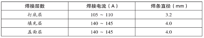 填充焊:各填充层均采用连弧多道焊,由坡口下方开始焊接,逐渐向上排列,每列焊缝压上道焊缝1/2,从左至右焊接,换焊条操作技术和立焊相同。选用4.0 mm焊条、140~145 A电流,填充层施焊前,应将打底层的熔渣和飞溅清理干净,打底层的接头处应修复平整。填充层的焊条角度为60°~70°,同时前倾5°~10°。