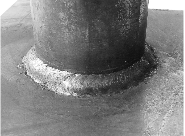 (3)盖面层:选用3.2 mm焊条,100~120 A电流,应将前一层的熔渣和飞溅物清理干净,施焊时的焊条角度、运条方法、接头方法与填充层相同,只是焊条水平摆动的幅度比填充层更宽。要点是时刻观察熔池变化,及时调整焊接手法,短弧焊接,管子和板的厚度不同,焊条的角度要随时略微变化,不能生搬硬套。盖面层成形如图3-26所示。