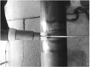 用焊枪上的按钮断续送电,使弧坑填满。焊接结束,检查钨极端头的形状和颜色,如形状和颜色发生变化,应当修磨再用。焊接结束后,关闭焊机,用钢丝刷清理焊件表面,检查焊件表面是否有气孔、裂纹、咬边等缺陷,使焊缝外观符合工艺要求。