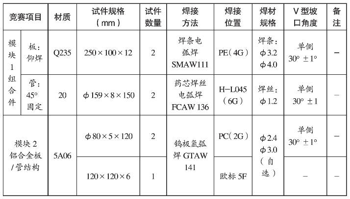 (1)除铝合金板/管结构项目可进行二次组对外,其他试件必须在比赛开始阶段打磨组对一次完成(组对时间由选手自定)。