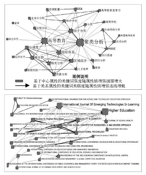 如图1所示,国内高等教育聚类分析研究有以下几组关键词共现强度较大,分别为聚类分析、高等教育、分类、高等学校、高等教育竞争力、主成分分析、综合评价、资源配置;社会网络分析、美国高等教育、共词分析、MOOC、知识图谱;国外则有以下几组关键词共现强度较大,分别为Higher Education,Quality,Quantity,Studies in Higher Education,A 360-Degree Approach,Teaching in Higher Education;Educational Psychology,Journal of Sports Science and Medicine等。