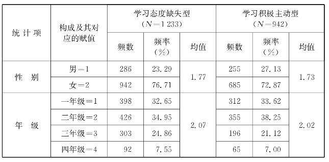 2 175位旅游专业本科生受访者中,学习态度缺失型受访者人数为1 233,占总被访人数的56.7%,学习积极主动型受访者人数为942,占总被访人数的43.3%,可以看出第一类群体在学校中所占比例要高于第二类群体,即旅游管理专业本科生中学习态度缺失型所占比例较高(见表4)。