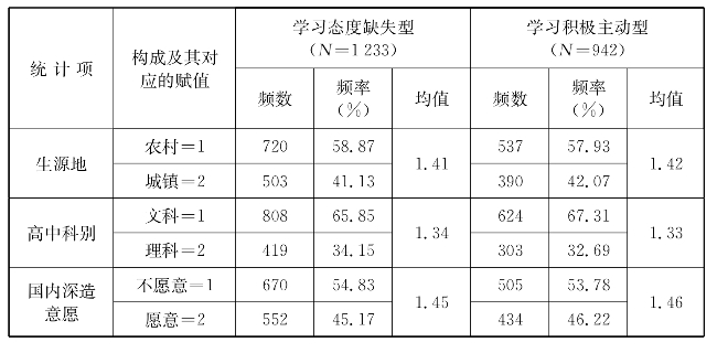 第一类学习态度缺失型受访者具有下列特点:(1)男女性别比例相差非常大,女性占76.71%,所占比例较高;(2)年级结构中二年级学生所占比例较大,为34.95%;(3)生源地中农村学生所占比例较大,为58.87%;(4)高中科别中文科所占比例较大,为65.85%;(5)不愿意在国内继续深造的学生所占比例为54.83%。