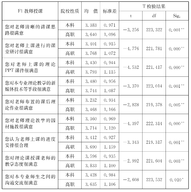 利用SPSS20.0软件分别计算了旅游专业本科生和高职生对教学满意度评价指标感知得分的均值和标准差;并利用SPSS20.0中两个独立样本T检验模块,考察本科生和高职生对教学满意度评价指标感知是否存在显著差异。分析结果如下: