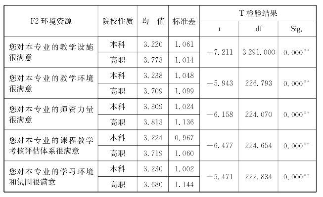 表2 旅游专业本科与高职学生在环境资源上的认知差异