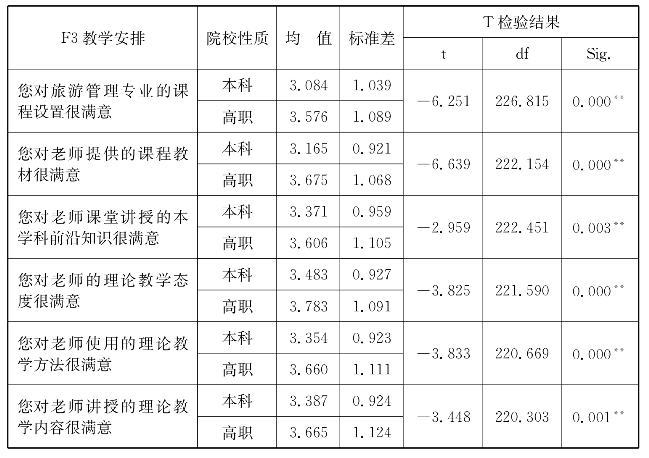 表3分析了旅游专业本科和高职学生对理论教学“教学安排”满意度的认知差异。该认知从“您对旅游管理专业的课程设置很满意”“您对老师提供的课程教材很满意”“您对老师课堂讲授的本学科前沿知识很满意”等6个方面来衡量。