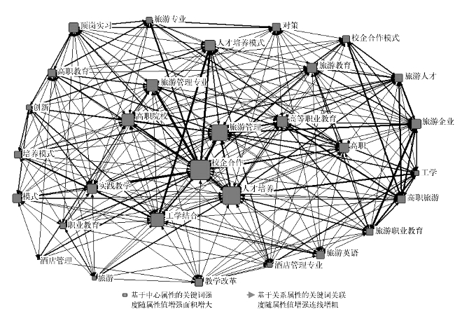 首先,中心关键词分析。由图2可知,国内与校企合作研究相关且中心度较大的关键词包括旅游管理、人才培养、工学结合、高职院校、高等职业教育,中心关键词说明校企合作研究与旅游管理研究成为国内旅游人才培养校企合作研究的主要领域。