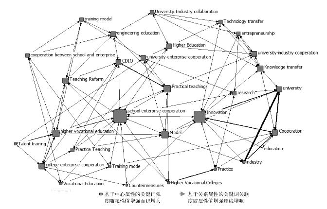 首先,中心关键词分析。由图3可知,国外与校企合作研究相关且中心度较大的关键词包括创新、实践教学、模式、高等教育、高等职业教育,中心关键词说明创新能力研究与培养模式研究成为国外相关研究的主要领域。