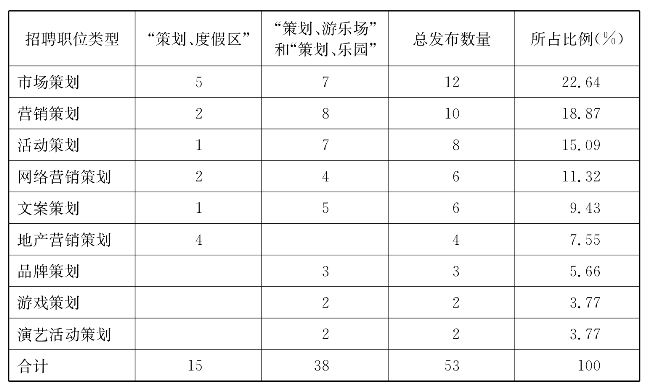 在百度招聘网中分别搜索关键词“策划、度假区”“策划、游乐场”和“策划、乐园”,对招聘信息进行筛选,获得每类招聘职位的信息共计53条,各岗位的需求数量和结构见表3。比较而言,游乐园对策划岗位的需求较多,有38条;市场策划岗的比例最高,占22.64%。营销策划岗不仅需求量大而且岗位分工细化,如网络营销、地产营销等。活动类策划也是这个行业所需要的,例如活动策划和演艺活动策划等。从策划的性质来看,以经营性策划居多,开发设计类策划几乎没有。