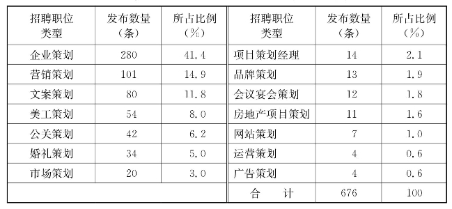 表2 酒店行业涉及策划职位的类型及招聘信息发布条数