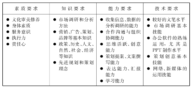 从旅游各行业策划类人才招聘信息中所反映的任职条件来看,对策划类人才的素质和能力等要求表现为四个方面:素质方面提出应聘者要有审美修养。游客旅游体验的过程也是审美的体验过程,要想使旅游者得到审美满足,旅游策划者自身就要具备基本审美能力。在知识方面,除需要基本的历史、自然、人文和社会等常识外,主要知识则为市场、营销知识与规划理念。能力方面要求具有良好的组织协调能力,该能力为完成策划任务所必备。策划工作往往是一种团队行为,沟通协调能力必不可少。此外,要具备基础性的数据收集与分析能力、书面文案与汇报介绍的表达能力等。对技术能力的最低要求是要能应用办公软件,熟悉网络与新媒体的应用。创意思维能力和过硬的市场开拓能力是策划人才的高要求,是旅游策划类人才的核心竞争力。