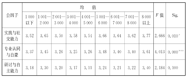 不同家庭收入的本科生对学习效果的实践与社交能力和专业认同与自豪两个公因子存在显著性差异,P分别为0.01和0.000(表3)。