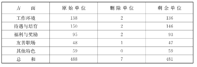 本研究编码规则如下:RE01A-1代表RE企业受访者在访谈大纲第一题之A项目的第一张卡片;在五大指标构面中得出490个分析单位,将单位分类之后,经由两位专家比较决定,并就不同意之部分与研究者讨论,经讨论后删除内容不清、语意模糊之字句,例如在工作环境构面有:“很明确就是每一个办公室都有个明确位置,如果你要申请职灾或是申诉的时候,依照什么条文你可以打什么电话,然后找谁”;“在大厅服务的话,都是以顾客为主。我们是蹲式服务”。待遇与培育构面有:“病假是半薪”;“我们这条线算是营业部门、营销部门、管理部门、通路事业部门”。福利与奖励构面有:“换好制服后就是服务人员,所以在这部分我们会比较特别要求一点点。”友善职场构面有:“店长是没有在下班的耶,店长是随时二十四小时要待命耶”等,删除单位如表2所示。