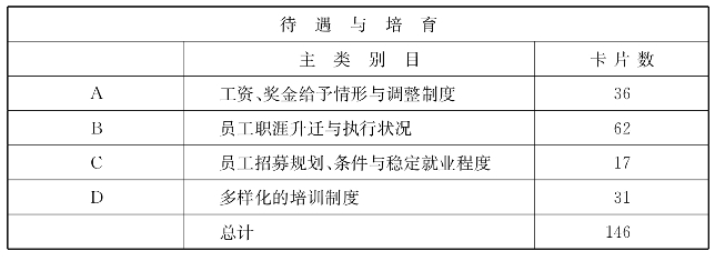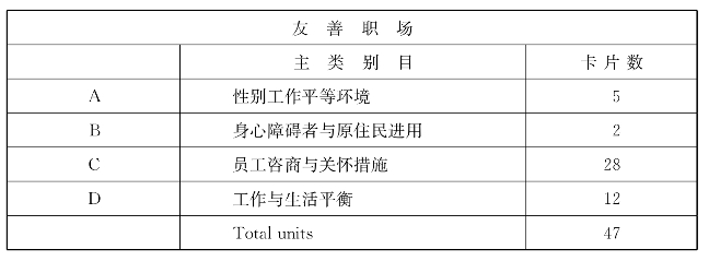 经由前述评判人Judge A、B and C之严谨、精确的分类程序后,五大构面共有21个类别项目,该21项类别目产生总共481个单位,即为幸福企业之植基模型(Grounded Model),结果如下: