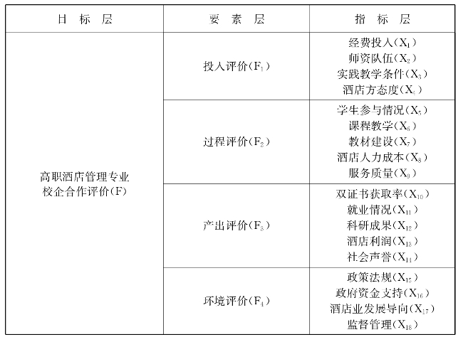 基于上述内容,根据相关研究,结合笔者的调查研究,本文从三个层次来构建有关高职酒店管理专业校企合作的评价指标体系,分别是目标层、要素层和指标层。目标层是对高职酒店管理专业校企合作进行评价,要素层分为4个因子,指标层共有18个因子(如表1所示)。
