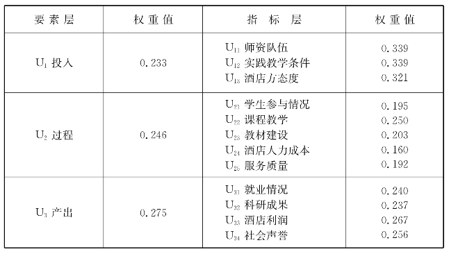 U2={U21,U22,U23,U24,U25}={学生参与情况,课程教学,教材建设,酒店人力成本,服务质量};