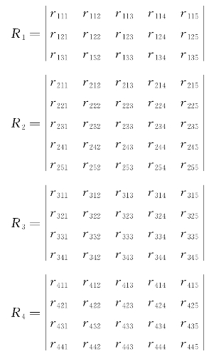 建立从因素集到评语集的模糊映射,对因素集U中的各个因素分别进行评判,并确定评判对象对评语集中各个元素的隶属程度r,继而确立评判矩阵R。即Uij(i=1,2,3,4;j=1,2,3,4,5)对评语Vc(c=1,2,3,4,5)的隶属度rijc。指标U1、U2、U3、U4的评判矩阵依次为R1、R2、R3、R4,即: