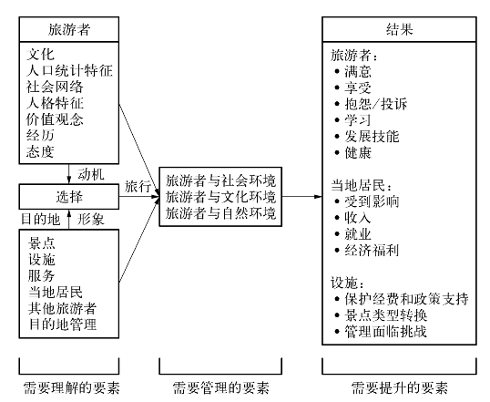旅游者行为与旅游动机之间存在着一条完整的逻辑链条。早在1966年,克劳森和尼奇就明确提出了著名的旅游者行为“五阶段说”,包括旅游期望阶段、去往目的地的旅程、目的地的旅游体验阶段、返回居住地的旅程和回忆评价阶段等。由此,将旅游者行为研究与消费者行为研究相区分开来;消费者行为研究主要着眼于产品的选择行为和满意评价行为研究[18]。皮尔斯在旅游者行为“五阶段说”的基础上,提出了对旅游者行为理解的一个概念图(图1)。在总结前人研究的基础上,皮尔斯的概念图指出旅游者的选择决策是由旅游者和旅游目的地两方面的要素共同影响决定的;而旅游者目的地体验行为则由旅游者选择决策决定,旅游者目的地体验行为是旅游者选择的具体实现[19]。尽管在克劳森和尼奇的“五阶段说”的基础上,旅游者研究已经细分到旅游期望研究、旅游决策行为研究、旅游体验研究、旅游满意度研究等领域,但是皮尔斯理解旅游者行为的概念图提醒研究者,旅游者行为是一个统一而连续的过程,割裂的研究不利于对旅游者行为的理解。不论旅游者的基本假设是经济人还是社会人,是理性的还是情感的,旅游者的行为总是符合一定的逻辑的。那就是,旅游者在目的地的体验行为是旅游者决策选择的结果。旅游者在目的地的体验行为可以是其在到访目的地之前规划设计的结果,也可能是到访旅游目的地之后现场反应的结果,更可能是同时受到前期计划和现场旅游环境等多因素影响下的决策结果。不论哪种情况,“旅游动机→旅游决策→体验行为”这个逻辑链条都是成立的。主题公园旅游者分类模型正是基于旅游者行为过程的逻辑链条。