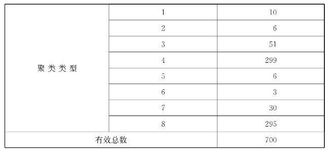 GPS轨迹数据包含旅游者的时间行为信息和空间行为信息,能够精确刻画旅游者在什么时间到达了什么地点,并且结合了游客在问卷中填写的到访景点的到达时间和离开时间,计算出游客在每个景点的停留时间。具体来说,在香港海洋公园大陆游客时空行为调查中所采用的手持GPS设备能够做到1分钟两次定位,定位的经纬度坐标精确至小数点后7位,即空间误差在10米以内。在获取了主题公园游客到访景点的停留时间后,若想基于时间地理学及旅游时空行为学对主题公园游客进行分类,则需要进行聚类分析。本文采用SPSS22.0软件中的K-Means聚类方法,将交通类景点剔除后,将剩余的景点划分为场馆类(海洋奇观等)、剧场类(威威剧场等)及娱乐类(疯狂过山车等)。以每个主题公园游客的到访景点的类型,及在相应类型的总停留时间为影响因素,在分析过程中剔除了干扰聚类的部分游客,最终获得如下聚类结果,将主题公园游客共分为8类,见表1和表2。