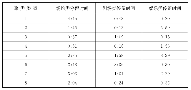 分析中根据游客在相应类型的停留时间的长短,以及总共的游玩时间,对八类聚类结果进行命名。可按照时间、空间行为特征进行区分,将总游玩时间较长的命名为长时型,相反则命名为短时型;将主要在场馆类景点中游玩的命名为场馆导向型,主要在剧场类景点中游玩的命名为剧场导向型,主要在娱乐景点中游玩的命名为娱乐导向型。因此,将类型一命名为“长时场馆导向型”;将类型二命名为“长时娱乐为主、场馆为辅导向型”;将类型三命名为“短时剧场导向型”;将类型四命名为“短时娱乐导向型”;将类型五命名为“长时娱乐为主、剧场为辅导向型”;将类型六命名为“长时剧场为主、场馆为辅导向型”;将类型七命名为“长时均衡型”;将类型八命名为“短时场馆导向型”。