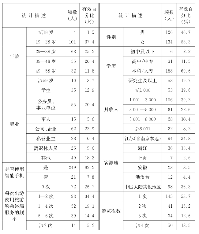 研究者一方面于2014年1月和2014年2月两度赴中山陵景区开展实地调研,选取部分游客,开展现场问卷调查;另一方面,结合旅游电子商务的快速发展,以途牛旅游网、携程旅游网以及网上问卷星的形式,针对性地就通过网络预订中山陵游览信息的游客(以自驾游、散客居多)进行问卷调查。此外,也依托南京台旅观光国际旅行社,针对性地选取部分团队游客进行问卷调查。本次调查共计发放问卷310份,回收问卷278份,回收率为89.67%。进而对回收的278份问卷的完整性进行整理,剔除超过3个问题没有作答的无效问卷,得到有效问卷270份,本次问卷调查的有效回收率为87.09%。