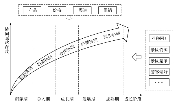 通过对大连圣亚海洋世界营销历程以及对营销协同发展的深入剖析,能够看出,在网络时代背景下,景区传统营销与网络营销的协同发展具有一定的阶段性与规律性。伴随景区的成长,传统营销与网络营销协同的层次和深度逐渐加强(图1)。