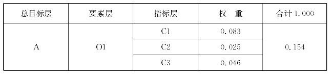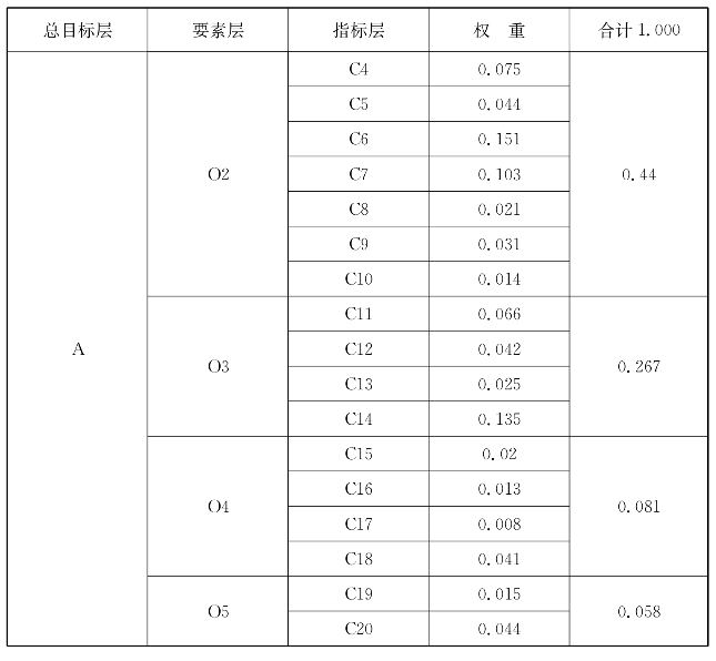 由计算可知,各层评价指标的判断矩阵都具有满意的一致性,所得的权重值可以采用。因此,将各个指标的权重与相应的中间层O1,O2,…,O5的权重进行加权,计算出各指标的组合权重,最终的评价指标体系及权重见表2。