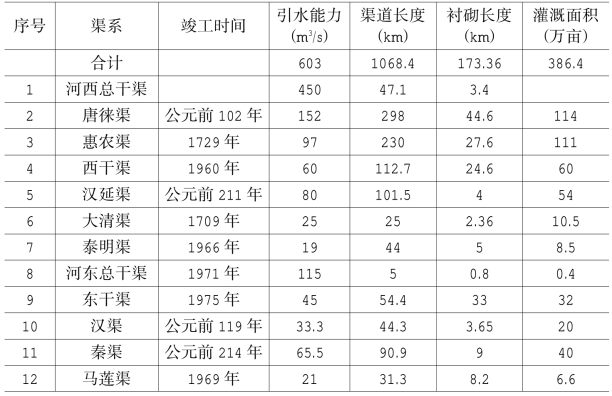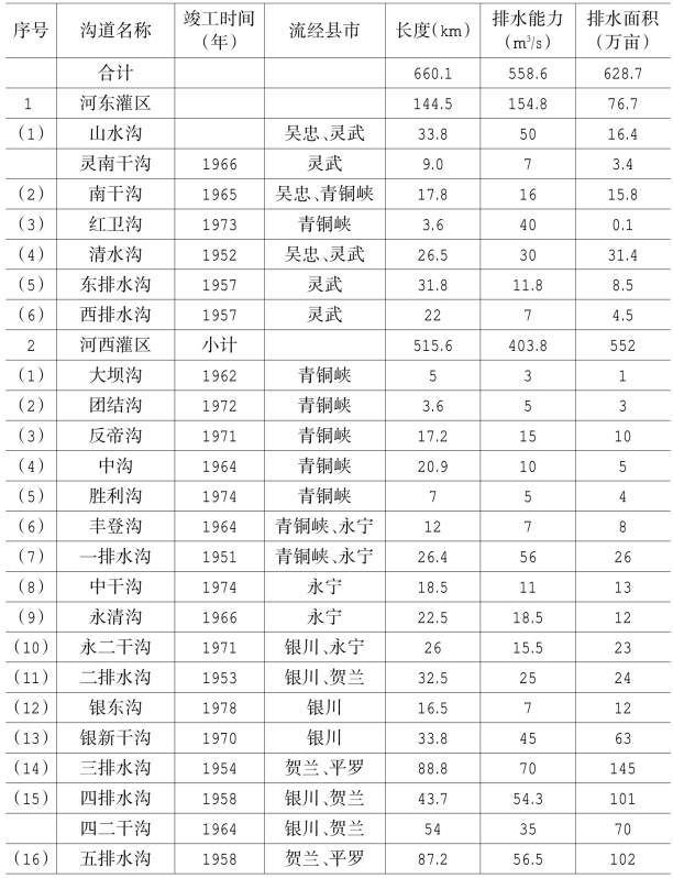 中华人民共和国成立后,各种水利工程,尤其是青铜峡水利枢纽的建成,使不少古老渠口所在地的水位上升,为新渠开建提供了条件,结束了长期以来的无坝引水历史,引黄灌区开始了整旧建新。国家对古老灌区进行了大规模的扩建和更新改造,宁夏相继开挖了跃进渠、西干渠、东干渠、第一农场渠和第二农场渠等新渠,完善了平原上的渠系建设。目前,宁夏平原干支渠总数已达3000多条,总长度7000多公里;排水沟有40条,总长度1825公里,建立了比较完善的灌排系统,灌溉面积增至800多万亩(表2-2和表2-3)