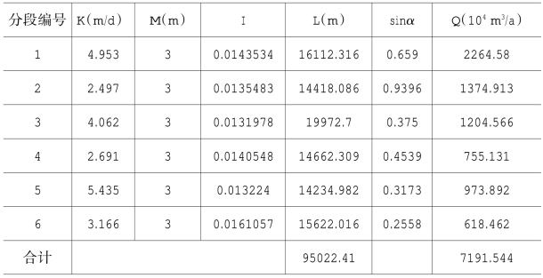 据地下水等水位线图,将黄河边界分为6段。在Arcmap图中连接相邻分段点,将相邻点的曲线距离大致作为入渗断面宽度,地下水水力坡度从流场图中量出。渗透系数和含水层厚度,根据分段点附近的钻探抽水试验资料获得。最终根据地下水等水位线图(图5-4)、经验值等带入公式计算出地下水和黄河的交换水量。