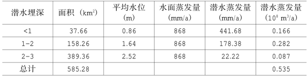 影响土面蒸发的主要因素是潜水水位埋深和包气带岩性。卫宁平原的地下水位埋深多小于3 m,蒸发埋深分区见图5-5。地下水蒸发极为强烈,是主要的排泄方式之一。本次取卫宁平原的极限埋深为3米,所用的蒸发度,是在计算区内县级以上气象站蒸发度观测资料的基础上,乘以0.62的系数。计算结果见表5-22。模拟期研究区蒸发量为0.54×108 m3/a。