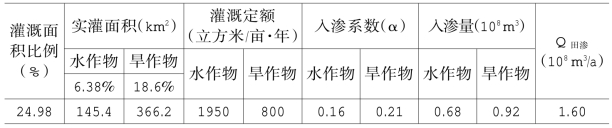 渠道引水量来源于各渠道管理所统计资料(渠道退水量已从引水量中扣除),渠系引水渗漏计算结果见表5-18。模拟期渠系渗漏补给量为0.39×108 m3。
