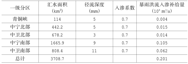 在研究区的北部和南部为卫宁北山、牛首山、香山与平原的分界线,接受山区基岩裂隙水和第四系沟谷潜流的地下水补给。根据前人资料同比推出山前侧向径流补给量和洪水散失补给量。洪水散失补给量计算中,暴雨径流入渗补给量计算公式如下: