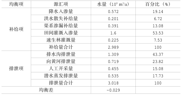 在均衡区内地下水补给量主要包括降水入渗补给、山前洪水散失补给、渠系渗漏补给和田间灌溉入渗补给;地下水排泄途径主要有潜水蒸发、人工开采、排水沟排泄和黄河排泄。