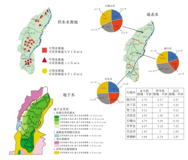 银川盆地多年平均降水量182.2 mm,降水量由南向北递减,银川盆地多年平均径流深在8~18 mm,天然地表水资源量为1.362×108 m3。2017年宁夏引扬黄河水量56.668×108 m3,其中银川盆地引扬黄河水量38.868×108 m3。银川盆地地下水资源量主要为引黄灌溉渠系及田间灌溉水的入渗而形成,地下水潜水总补给量为16.969×108 m3/a,如图5-8所示,银川盆地主要地下水资源集中在引黄灌区内,主要接受引黄河水的补给。银川盆地的地下水主要是贺兰山地下水系统和银川盆地地下水系统,分区系统及可开采量见图5-8中右侧表所示。银川盆地地下水主要属于松散岩类孔隙水,天然资源丰富,地下水的补给模数很大。从各行政区分布情况来看,地下水主要分布在银川市和吴忠市境内,石嘴山市相对较少。银川平原的水源地中大部分分布在银川市及吴忠市,占水资源总量的79.79%,其中包括6个大型水源地,另一部分分布在石嘴山市,水资源量相对较少。因此,水源地集中分布的地方也是地下水比较集中的地方,说明水源地的开发和地下水分布情况有着密切的关系。