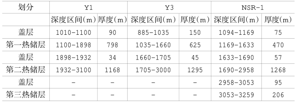 根据Y1和Y3井测温曲线可知,虽在第四系内有地温>25℃的地层存在,为孔隙性热储,但分布很小,此次评价中忽略。新近系和古近系及其下在局部奥陶系地层存在可开采热储,为裂隙型热储。