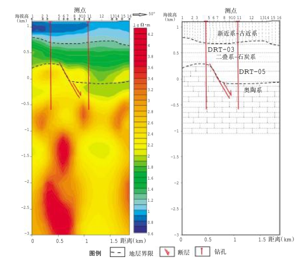 大地电磁测深剖面L5线反演解释(图6-10)分析认为:自二叠系—石炭系伊始发育一正断层,断层向下延伸将二叠系—石炭系底界面上下错断,断层切割位置在地表的投影位置位于L5线5~8号点间。结合黄河断裂带的分布,DRT-03孔、DRT04孔与DRT-05孔分别位于断层两侧,DRT-05位于正断层的上盘,DRT-03和DRT-04位于正断层的下盘,上下盘之间错断距离220 m左右,断层倾向南。