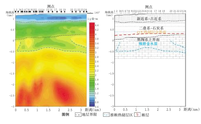 通过大地电磁剖面反演解释,查明了区内断层位置和走向,解释了DRT-03孔与DRT-05孔奥陶系顶界面落差较大的原因,分析了剖面延伸方向上构造单元的电性结构特征,厘定了区内地层埋深,推断了地热含水层主要赋存部位。