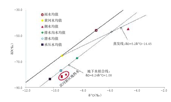 (2)地热水同位素分析。滨河新区地热水同位素分析(图6-14)显示,与银川盆地其他水体构成的同位素分布体系相比,滨河新区地热水不遵循盆地中部各水体同位素分布特征规律。滨河新区地热水与银川盆地深层地下水同位素特征存在较明显的差异,该地热水不是来源于银川盆地中部,黄河断裂作为一条阻水断裂,阻止了盆地内地下水向东部边缘运移。