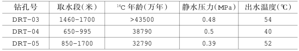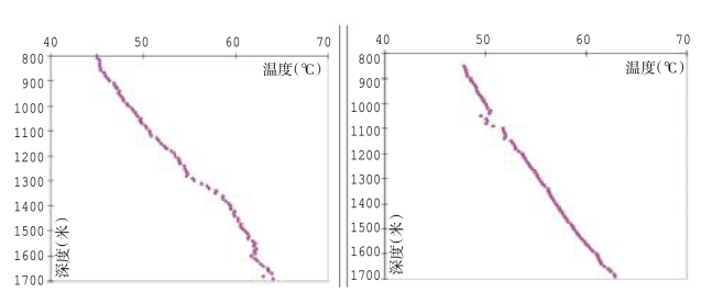 DRT-03与DRT-05两孔开展了井温测井,并依此计算出地层平均地温梯度值。DRT-03孔1691 m深度最高测井温度64.09℃,平均地温梯度为2.86℃/100 m;DRT-05孔1690 m深度最高测井温度62.9℃,平均地温梯度2.78℃/100 m。测温曲线在形态上表现为较缓的斜直线型,温度随深度增加而均匀升高。该类型地热资源的地温梯度属于正常的地层积温范围,未发现地温异常层位,即该类型地热资源的热来源为地层积温,并非由构造活动沟通深部热源所致(图6-9)。