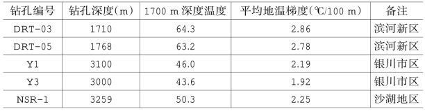 收集资料显示,银川盆地内前人勘探的三口地热井地温梯度值明显偏低,其中地温梯度最高的NSR-1井地温梯度仅为2.25℃/100 m,在相同的1700 m深度其温度仅为50.3℃(表6-7)。二者对比发现,在相同深度下滨河新区地热井的温度及地温梯度值较盆地内地热井明显更高,但依然在正常的地层积温范围内,与东部鄂尔多斯盆地地温梯度趋近一致,并非地热异常区。